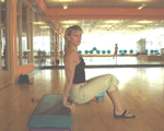 1.單腳踩在一略具高度的平台上,另 一腳則踩在平地上,雙手各握一重物( 如啞鈴或礦泉水瓶)放置在身體兩側, 保持上半身垂直。 2.雙腳呈現前弓後箭的姿勢,上半身 不動,身體重心垂直下壓,雙手動作保 持不變,維持數秒後再還原。 |