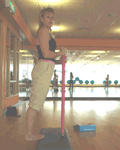 小腿線條的雕塑 1.以一稍具高度的平台為站立點,拿 一根長約到腰部的棍子,直立在身體正 前方,雙腳微微打開,腳尖踩在平台上 ,後腳跟懸空,雙手握住棍子的頂端。 2.以長棍支撐全身重量,墊起腳尖往 上提,停數秒後再還原。 |