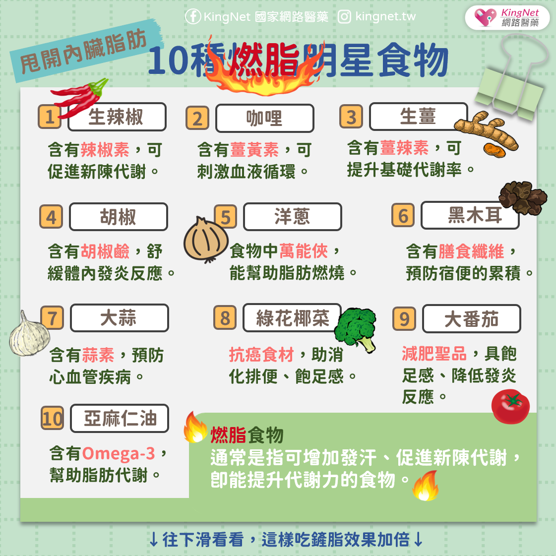 內臟脂肪過高可能對健康構成風險,不過有許多食物可以幫助甩開內臟脂肪。以下是10種燃脂的明星食物,能促進新陳代謝,幫助消除內臟脂肪!