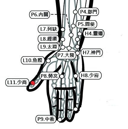 手掌微握拳,拇側向上,以拇指指甲內上角與第一節橫紋頭做一直線,復將爪甲底延長,當兩線之交叉點,以手尋之微呈凹陷處,按之痠脹是穴。