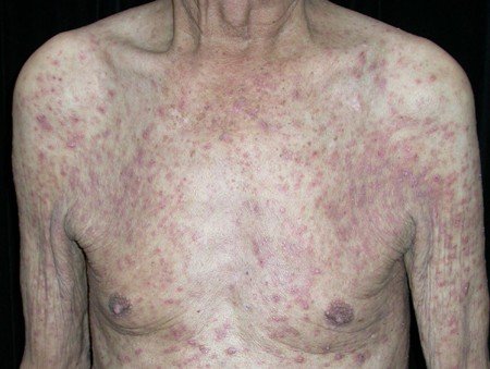 圖四 七十五歲男性疥瘡患者,全身劇癢併廣泛性紅色丘疹與結節。