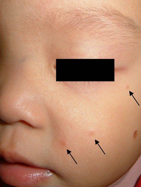 圖三 八個月大女嬰,臉上有散在性丘疹樣病灶,皮屑經顯微鏡檢查後證實為疥瘡。