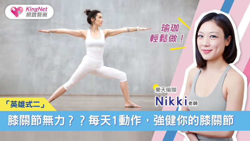 膝蓋老是痠軟無力?Nikki老師傳授強健膝關節的「英雄式二」,該體位法能強化大腿、髖關節,矯正腿部線條,並鍛鍊股四頭肌,減少膝蓋和關節受傷機會;也能伸展脊椎、腹部、手臂,強化核心肌群,完美身材曲線。