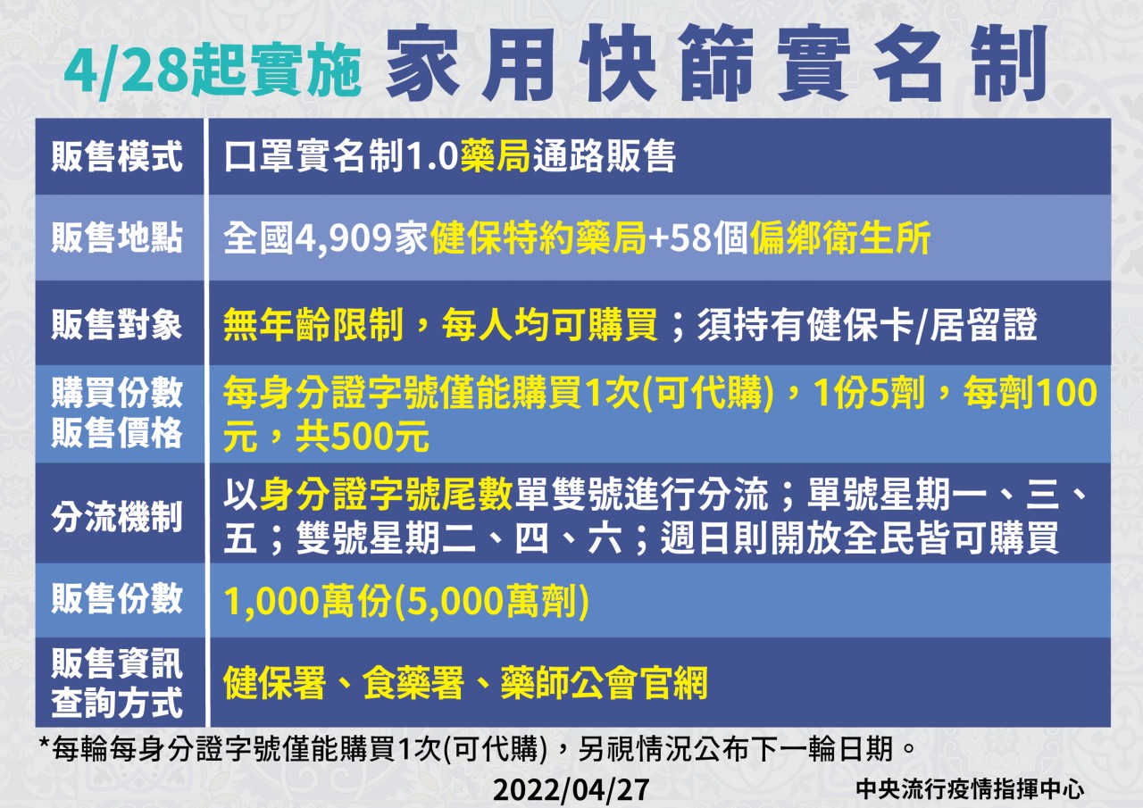 COVID-19國內疫情急速上升,民眾對於家用快篩試劑的需求增加,中央流行疫情指揮中心今(27)日宣布家用快篩試劑販售實名制自今(2022)年4月28日上路,希望讓更多有需要的民眾買得到平價的實名制家用快篩試劑,平抑市售家用快篩試劑售價,以利控制疫情,並維護民眾健康之權益。