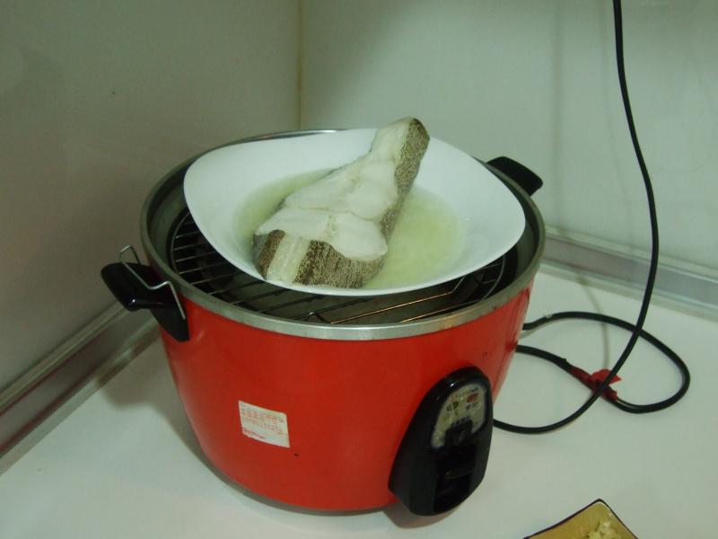 待電鍋跳起,取出鮮魚將佐料放在魚上,