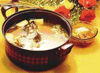 取下石斑之魚頭及中骨加 5杯水煮開 2分鐘後加入豆腐及化開之味噌,同煮後,待滾時再加入蔥段即熄火,盛起上桌。