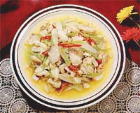 3.餘油留 2湯匙入薑片、芹菜段加3料拌炒幾下,加入魚片拌勻即可。