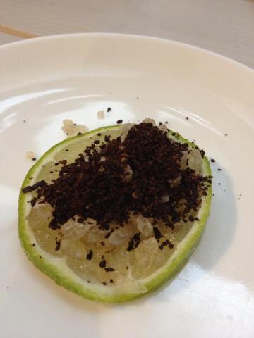 3) 小碟先放檸檬薄片、再舖上一層冰糖,最後灑上咖啡粒。