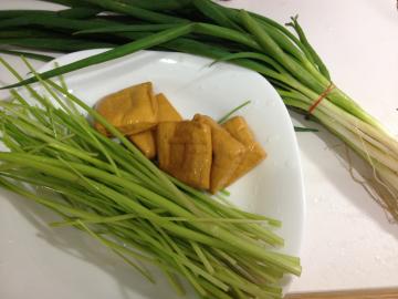 2) 芹菜、豆干、葱切段。