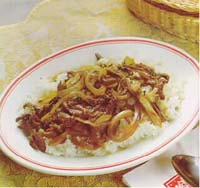 油三大匙燒至六分熱,將牛肉絲倒下炒散即可盛起,餘油燒熱,再將 洋蔥絲倒下鍋炒香,加下醬油、糖、胡椒粉、牛肉倒下鍋炒勻即可盛 在飯上面(二人份)。