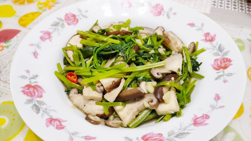 香菇是低熱量、高蛋白、高膳食纖維的食材,搭配空心菜拌炒,可增加色澤和豐富口感。