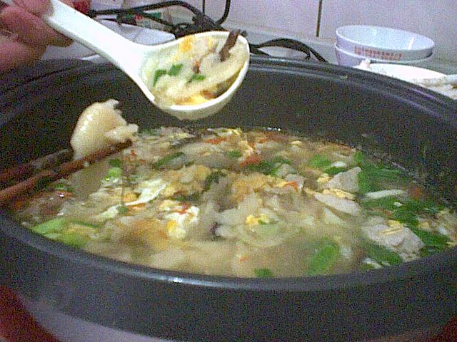 五、倒入大骨高湯,放入麵疙瘩,湯滾後打個蛋花,熄火後灑上三星白蒜。