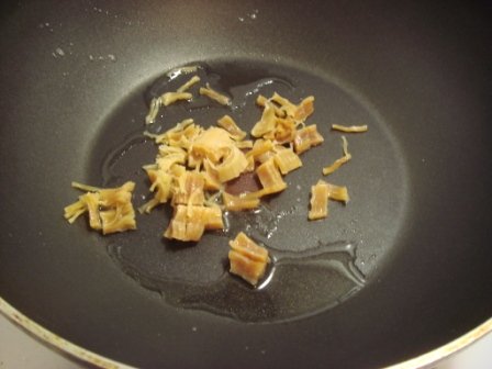 1起油鍋將泡開的干貝捏碎放入鍋中拌炒