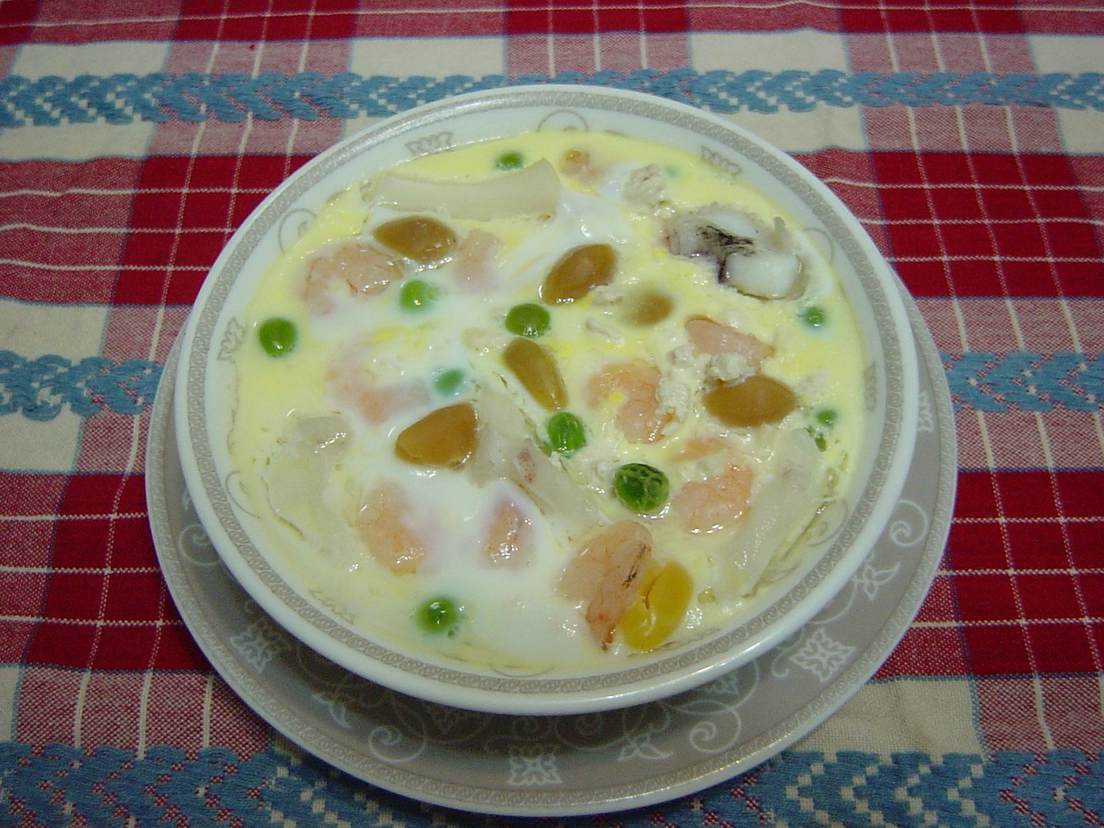 A海鮮銀杏蒸蛋:蝦仁.銀杏.豌豆仁.雞蓉.花枝.柴魚粉.雞蛋