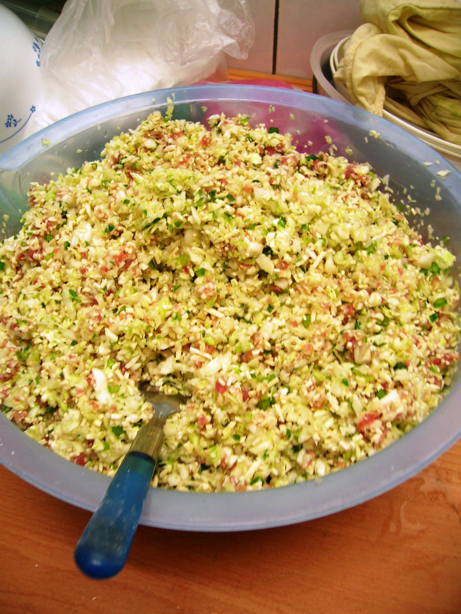 將高麗菜.豆腐絲.韭菜.剁細..