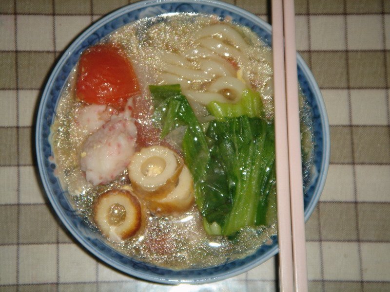 1.烏龍麵2包、蕃茄1顆、青菜少許、水適量。