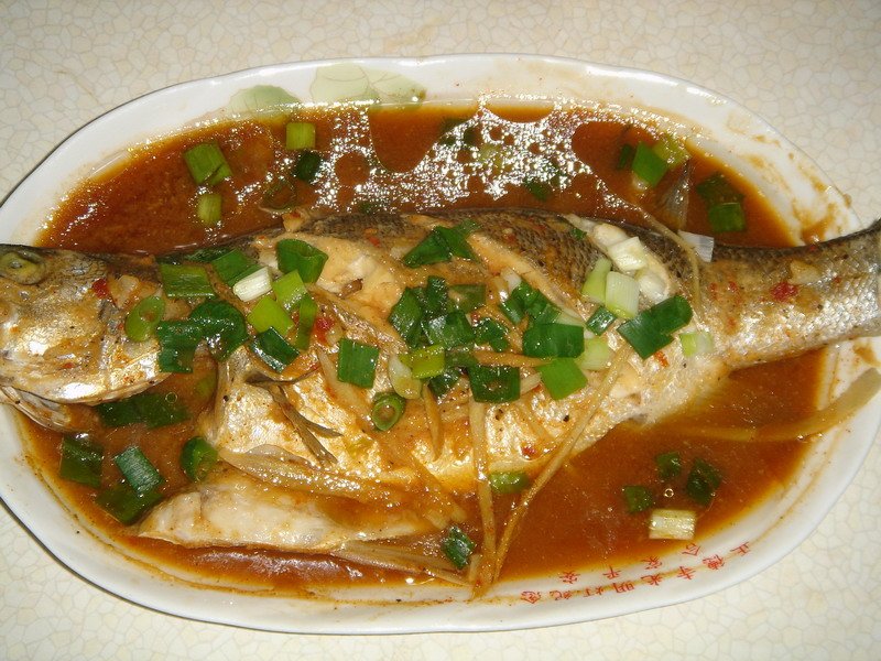 4.將鱸魚移至滾沸爐火中蒸約半小時,將青蔥以熱油爆香。
