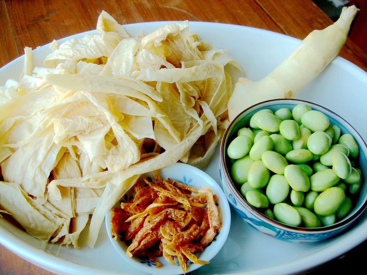 豆皮4張、毛豆仁 20元、蔥珠、薑末、櫻花蝦米末各少許、高湯1杯