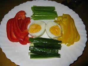 西洋芹、小黃瓜、紅黃甜椒分別擺放盤子四邊,中間放置水煮蛋