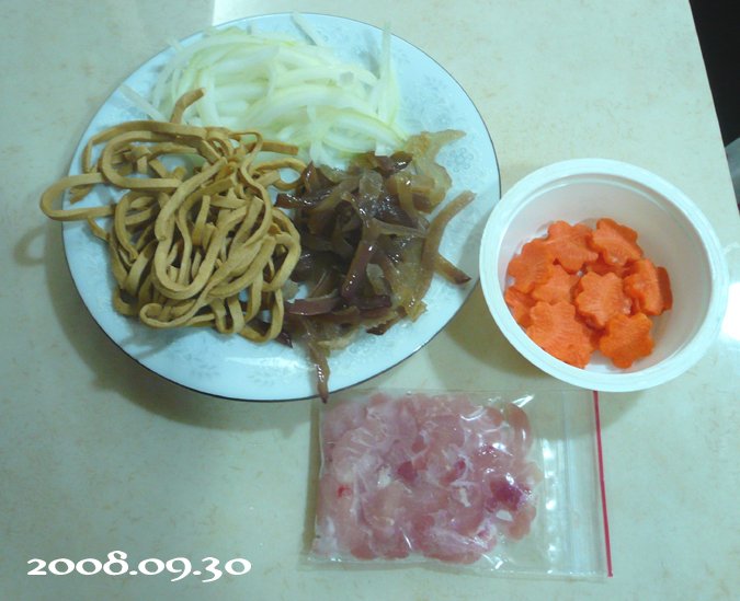 3.炒鍋入油先放下肉絲翻炒至變色,放下胡蘿蔔、木耳、豆干等絲續炒2分鐘,加入調味料,再放進洋蔥絲續炒1分鐘即可盛起供食。