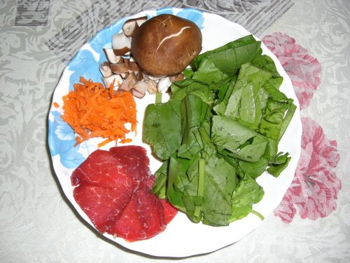 配料:香菇、胡蘿蔔、菠菜、牛肉片∼ 適量。