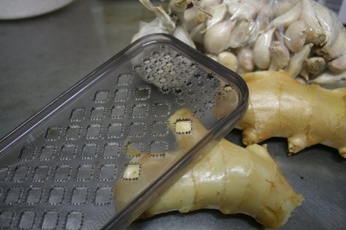2.老薑切片,蒜頭拍打,起油鍋,加入適量的沙拉油及麻油拌炒爆香