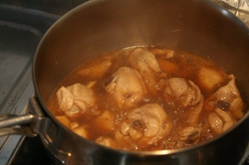 3.入雞塊一起炒,略熟後倒入醬油、糖及水一起燒
