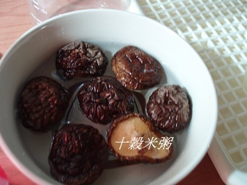 3.將以上米類洗淨,加上8-9杯水量,泡約3-4小時,可加上泡香菇的水∼使米吸飽水,煮起來比較容易軟爛!