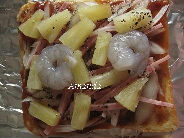 依序鋪上洋蔥絲、火腿絲、鳳梨絲、擺上2隻蝦仁、灑黑胡椒粒、起士條