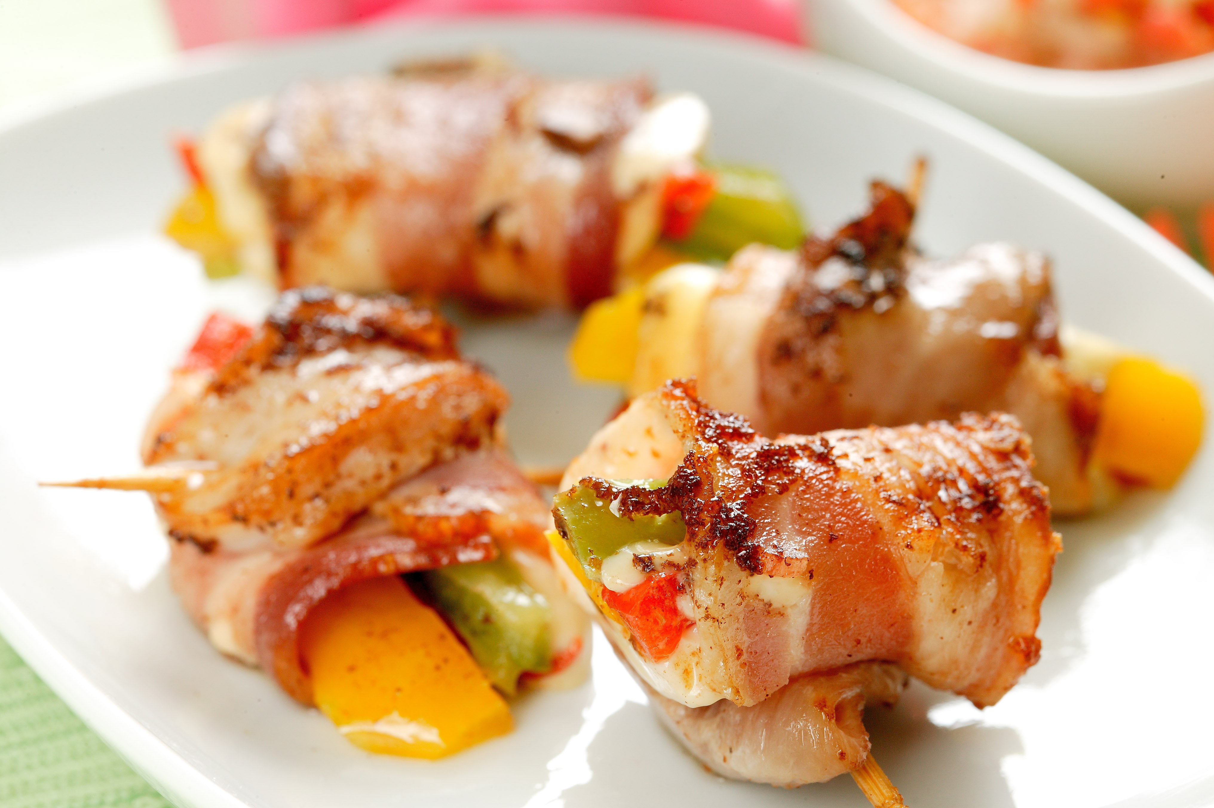 3. 將培根捲包起司及甜椒條,再以棒腿片包捲起來。