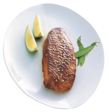 2. 拉出烤盤,在魚片上刷些照燒醬,續烤3分鐘,取出裝盤,撒些白芝麻,旁邊再擺上檸檬搭配即可。