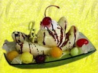 鳳梨榨汁加入適量開水與果凍粉加熱後倒入碗中放入冰箱冷卻成果凍,將川燙過的白木耳冷卻後舖於果凍上成珊瑚海,再將香蕉置於兩側,中間放上冰淇淋、加上其他適量水果裝飾四周,再淋上調味醬,幸福滿溢的香蕉船出航。