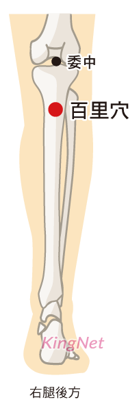 屈膝,膕窩內側的兩條肌腱(半腱肌肌腱與半膜肌肌腱)間的凹陷中在膕橫紋內側。