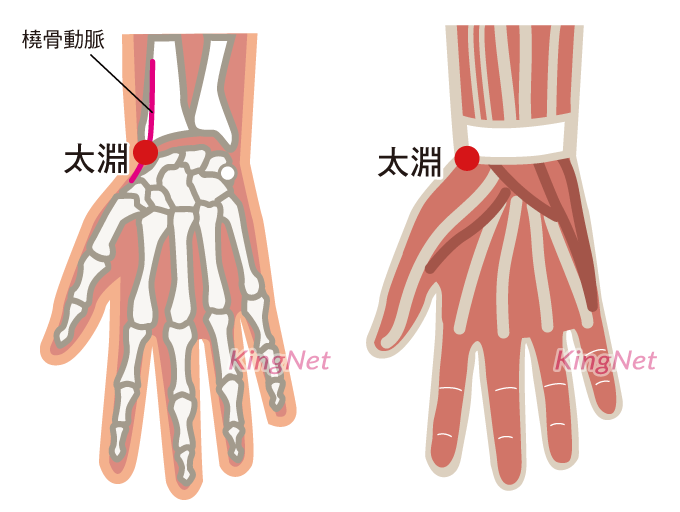 手掌側橈側手腕,手舟狀骨與橈骨莖突間,橈動脈搏動處。