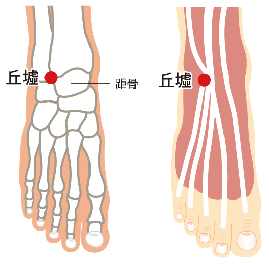 腳背,距骨與脛骨內踝外側、腓骨外踝內側之間的凹陷中或外踝尖端的前下方凹陷。