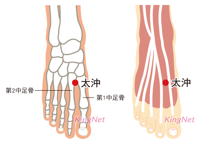 腳背,拇趾與食趾近節趾骨底之間的凹陷中赤白肉際處。